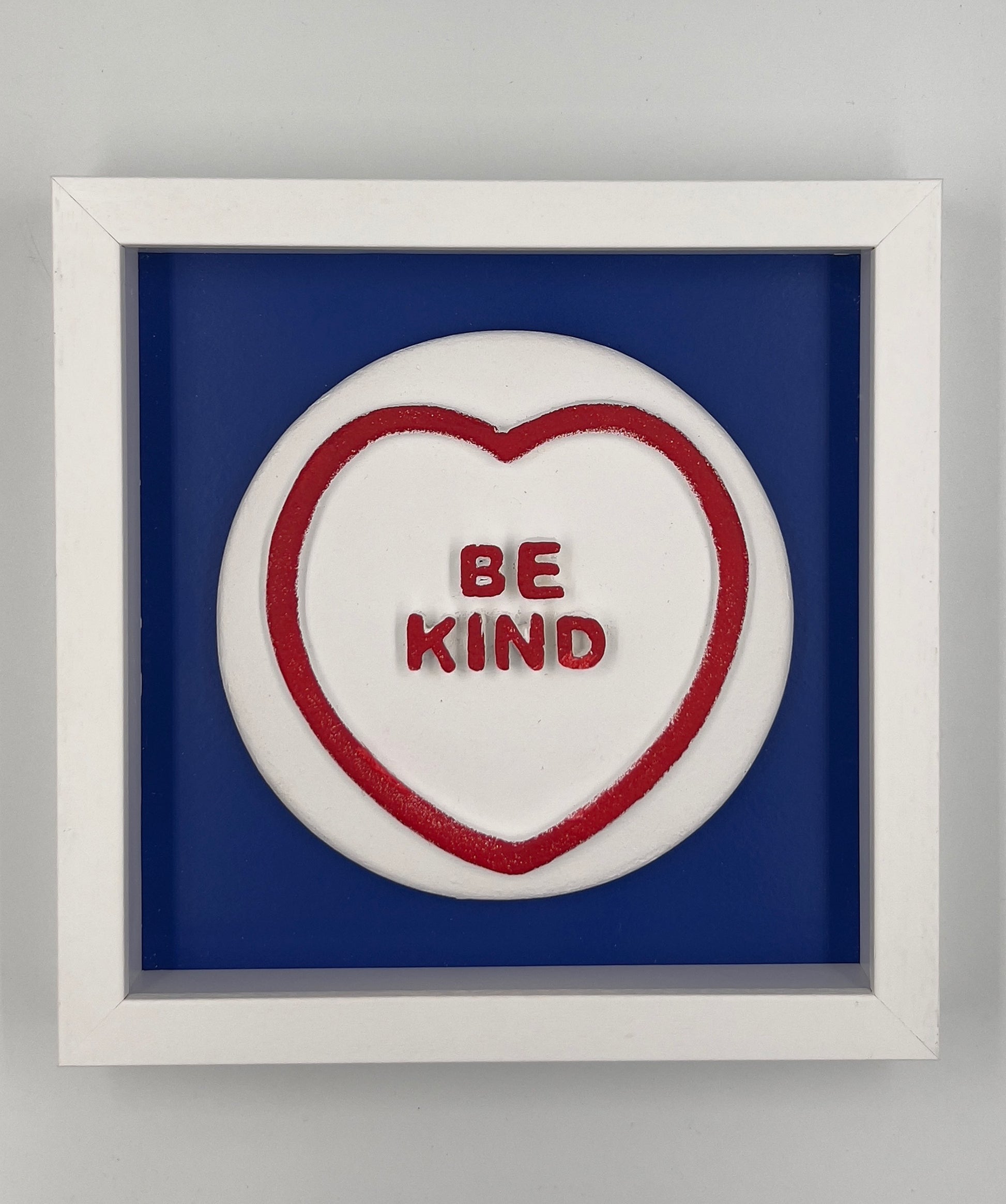 Hand-cast and painted love heart sweet, custom framed with UV protective, non-reflective art glass. Signed by the artist on the reverse