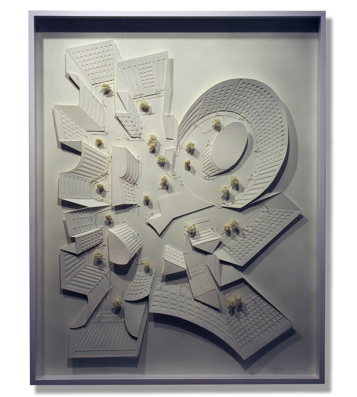 Hand-cut card, wood, and paint. Plexiglass protection.