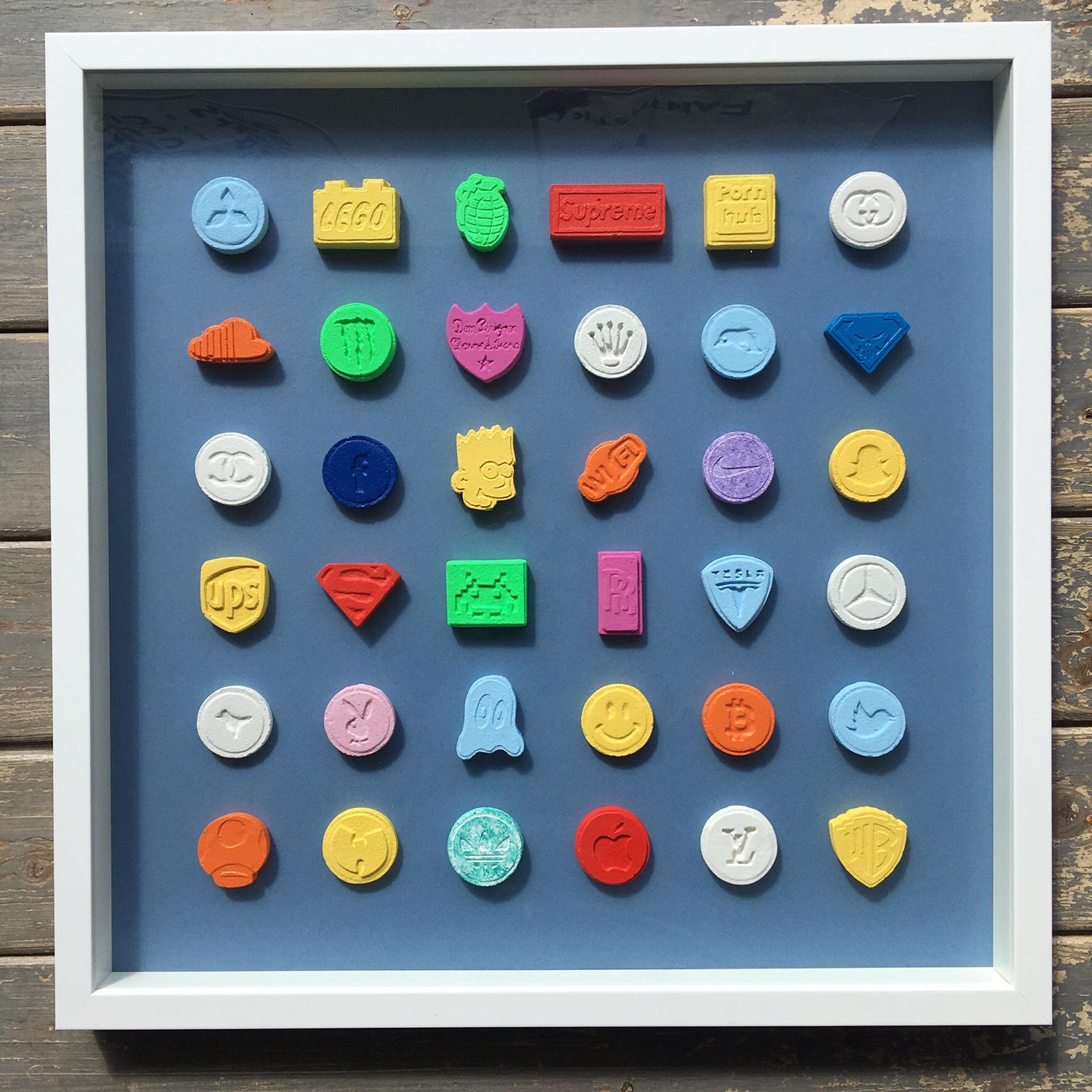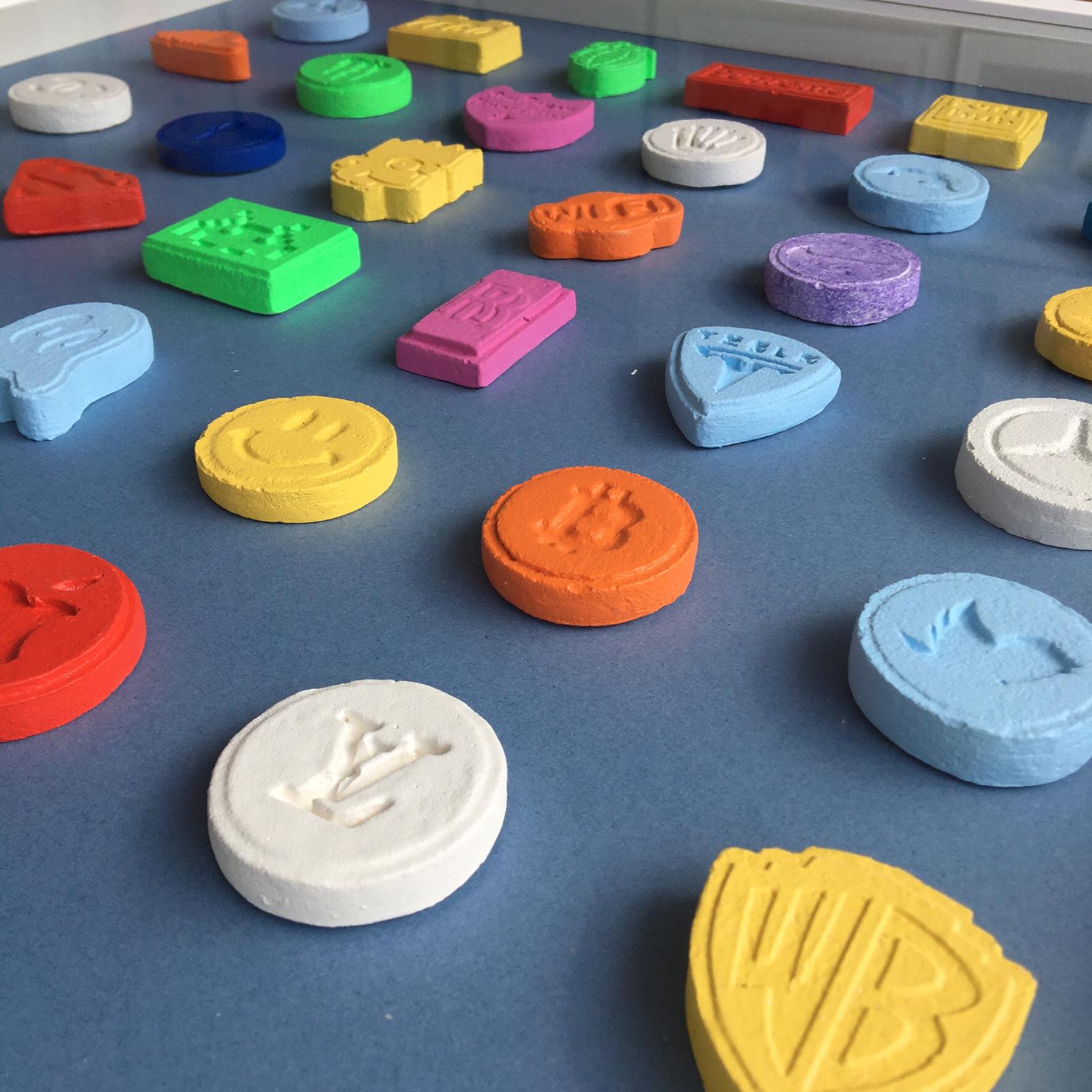 Full set of hand-moulded and painted ecstasy pills framed in white, on a variety of background colours.